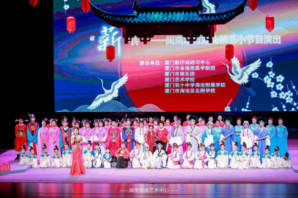 揭牌仪式后,中心响起了悠悠戏韵。“薪·传”——闽南地方戏曲精品小节目在这里精彩上演。厦门歌仔戏研习中心和厦门市金莲陞高甲戏剧团的名角们携厦门艺术学校、厦门双十中学海沧附属学校、海沧区北附学校的孩子们登台献演,为观众带来了高甲戏《丑诙旦韵》、歌仔戏唱唐诗《春晓》《静夜思》、歌仔戏《陈三五娘》经典名段《睇灯》、南音版阿卡贝拉和声唱《乐趣》《剑舞》以及老中青三代台演绎的歌仔戏《三家福》等精彩节目,“视觉+听觉”的双重极致享受,为广大观众带来全新体验。