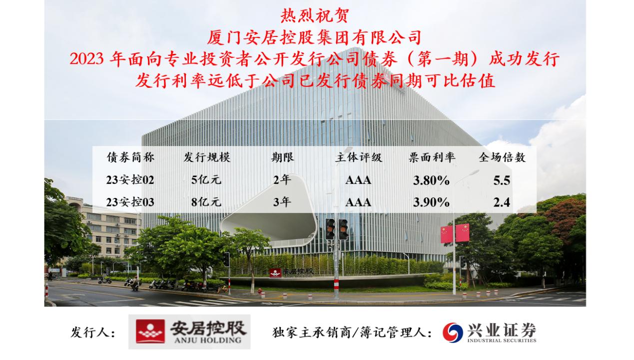 2月8日,安居控股集团成功发行2023年面向专业投资者公开发行公司债券(第一期)。本期债券发行总规模13亿元,其中两年期发行规模5亿元,票面利率3.8%;三年期发行规模8亿元,票面利率3.9%。